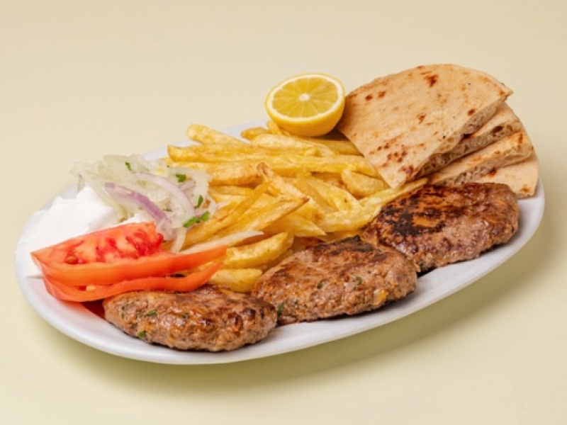 3 Τεμάχια, από μοσχαρίσιο κιμά. Συνοδεύεται από πίτα, πατάτες τηγανητές, ντομάτα, κρεμμύδι & γιαούρτι